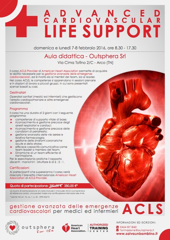 Il 7 e 8 febbraio 2016, presso la nostra sede di Arco (TN), si terrà il primo corso ACLS - Advanced Cardiovascular Life Support secondo le nuove linee guida American Heart Association 2015. Con questo corso, rivolto prevalentemente agli operatori sanitari che operano nell'emergenza a tutti i livelli, l'International Training Center Outsphera For Life arricchisce la propria offerta formativa con programmi di indiscussa qualità e riconosciuti in tutto il mondo. Il corso ACLS - Advanced Cardiovascular Life Support prevede il rilascio di una certificazione internazionale American Heart Association. Per partecipare al corso ACLS - Advanced Cardiovascular Life Support del 7 e 8 febbraio (ad un prezzo speciale), o per organizzarne uno presso la Vostra struttura, contattateci al numero 0464 871860 o via mail all'indirizzo |