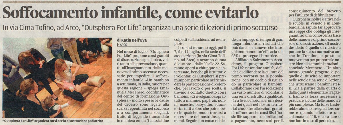 Outsphera for life è un centro di formazione che ha a cuore la salute e la sicurezza dei bambini: per questo offre a chi accompagna i più piccini durante l’estate, un corso di rianimazione e disostruzione pediatrica.
