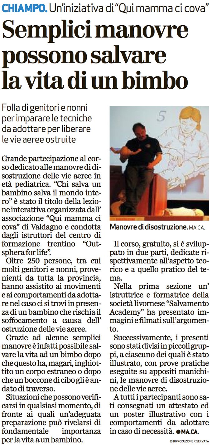 Grande partecipazione al corso dedicato alle manovre di disostruzione delle vie aeree in età pediatrica. "Chi salva un bambino salva il mondo intero" è stato il titolo della lezione interattiva organizzata dall’associazione "Qui mamma ci cova" di Valdagno e condotta dagli istruttori del centro di formazione trentino "Outsphera for life".